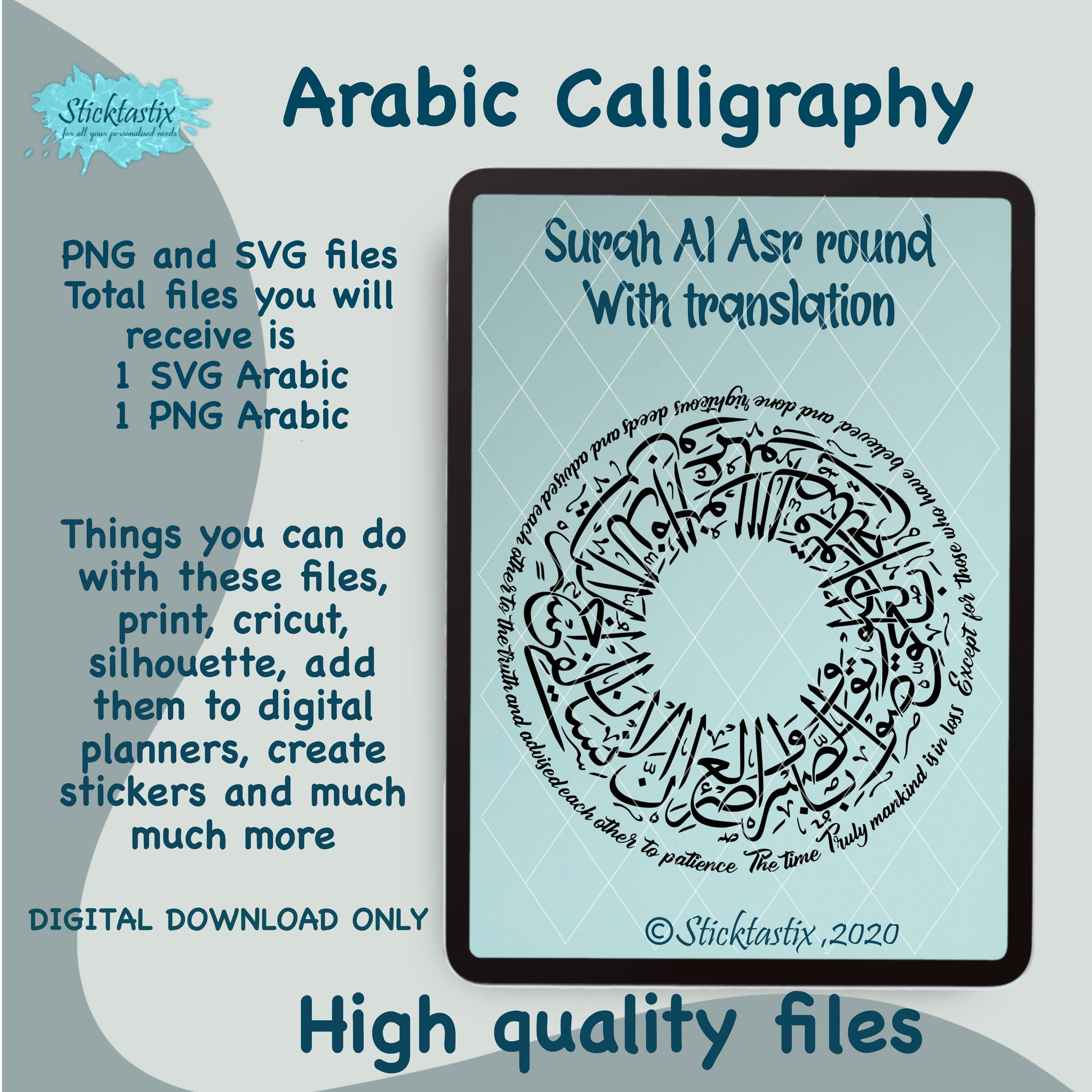 Surah Al Asr round with translation for clock without numbers Arabic calligraphy SVG PNG, digital download file